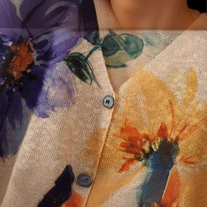 Cotton and linen knitted short-sleeved 2024 summer new retro printed ethnic style cardigan T-sleeve