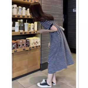 Summer new short-sleeved striped dress women’s oversize T-shirt slimming versatile long skirt Fabric name: cotton Pattern: Stripes Craftsmanship: stitching